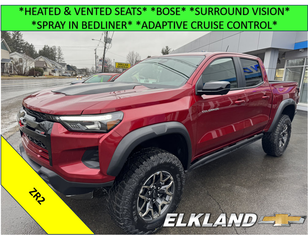 New 2026 Chevy Colorado ZR2 in Radiant Red Tintcoat. Equipped with Leather interior, Heated and Vented seats, Heated Steering wheel, Technology package which adds the Surround Vision and Bose speakers, Remote start, Spray in bedliner, Trailering package, and more.