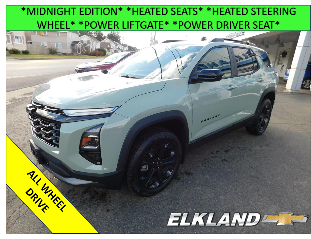 New 2026 Chevy Equinox AWD LT in Cacti Green. Equipped with black Evotex interior, Midnight Edition, Heated seats, Heated steering wheel, Power driver seat, Power liftgate, Remote start, Adaptive cruise control, and more.