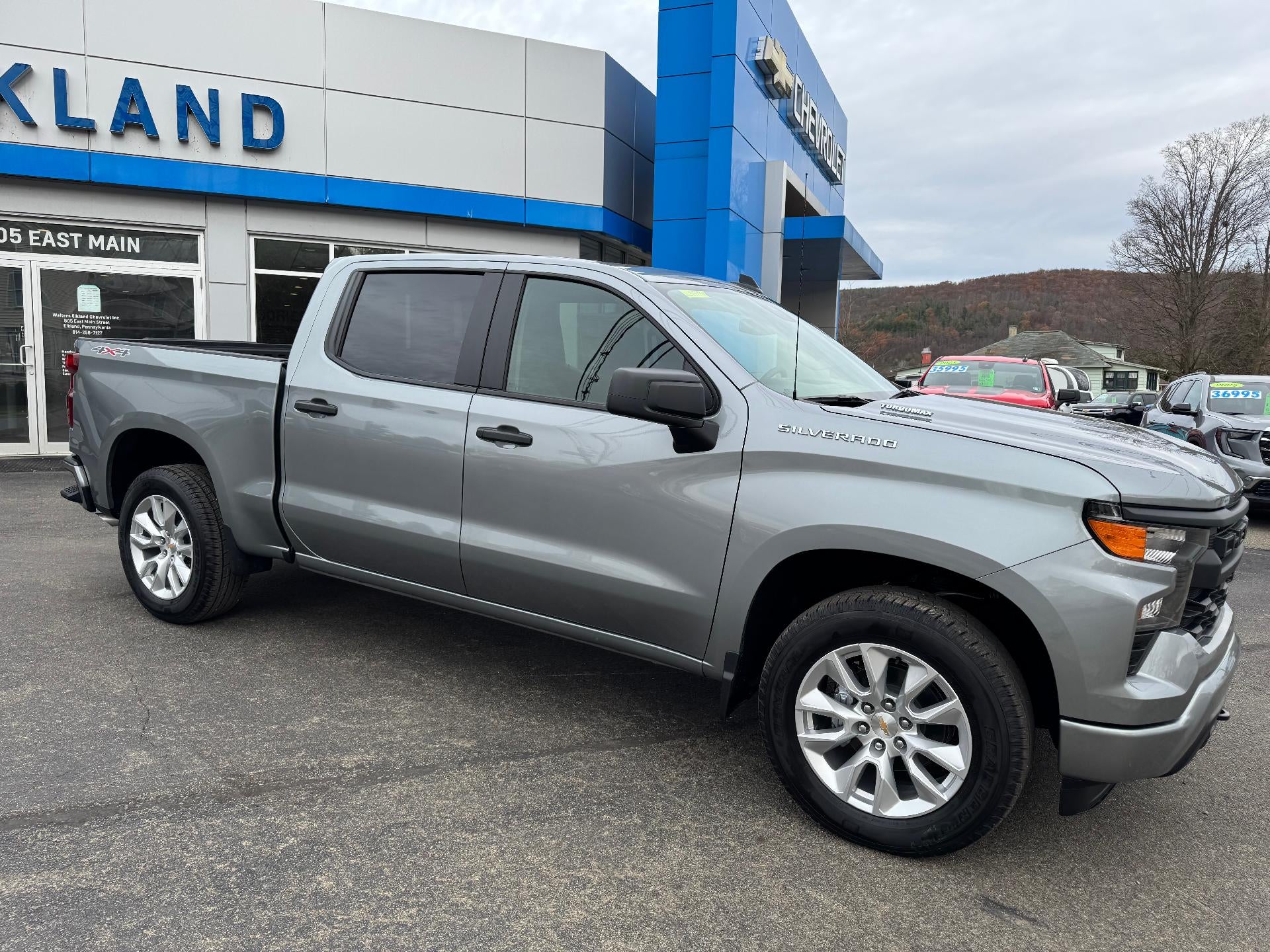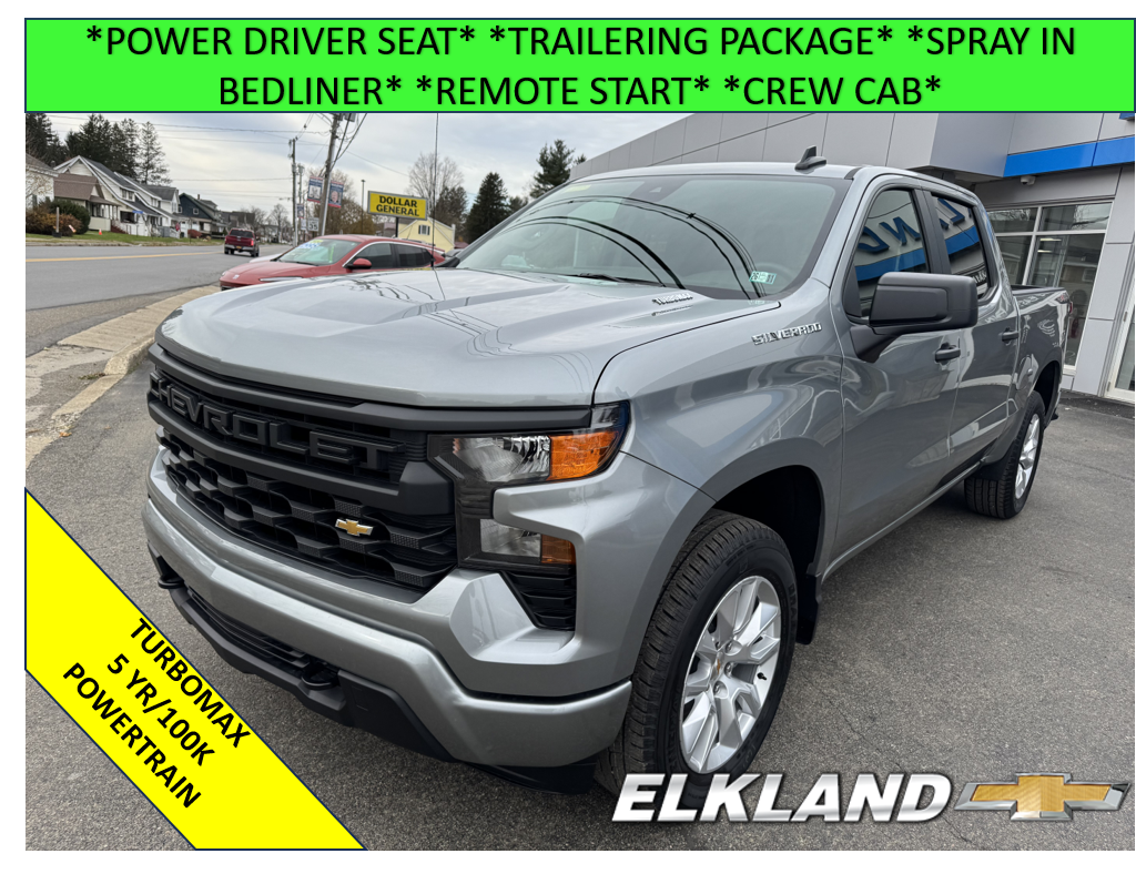 New 2026 Chevy Silverado 1500 Crew Cab Custom Turbomax in Sterling Gray Metallic. Equipped with cloth interior, Power driver seat, Trailering package, Remote start, Spray in bedliner, Auto locking rear differential, and more.
