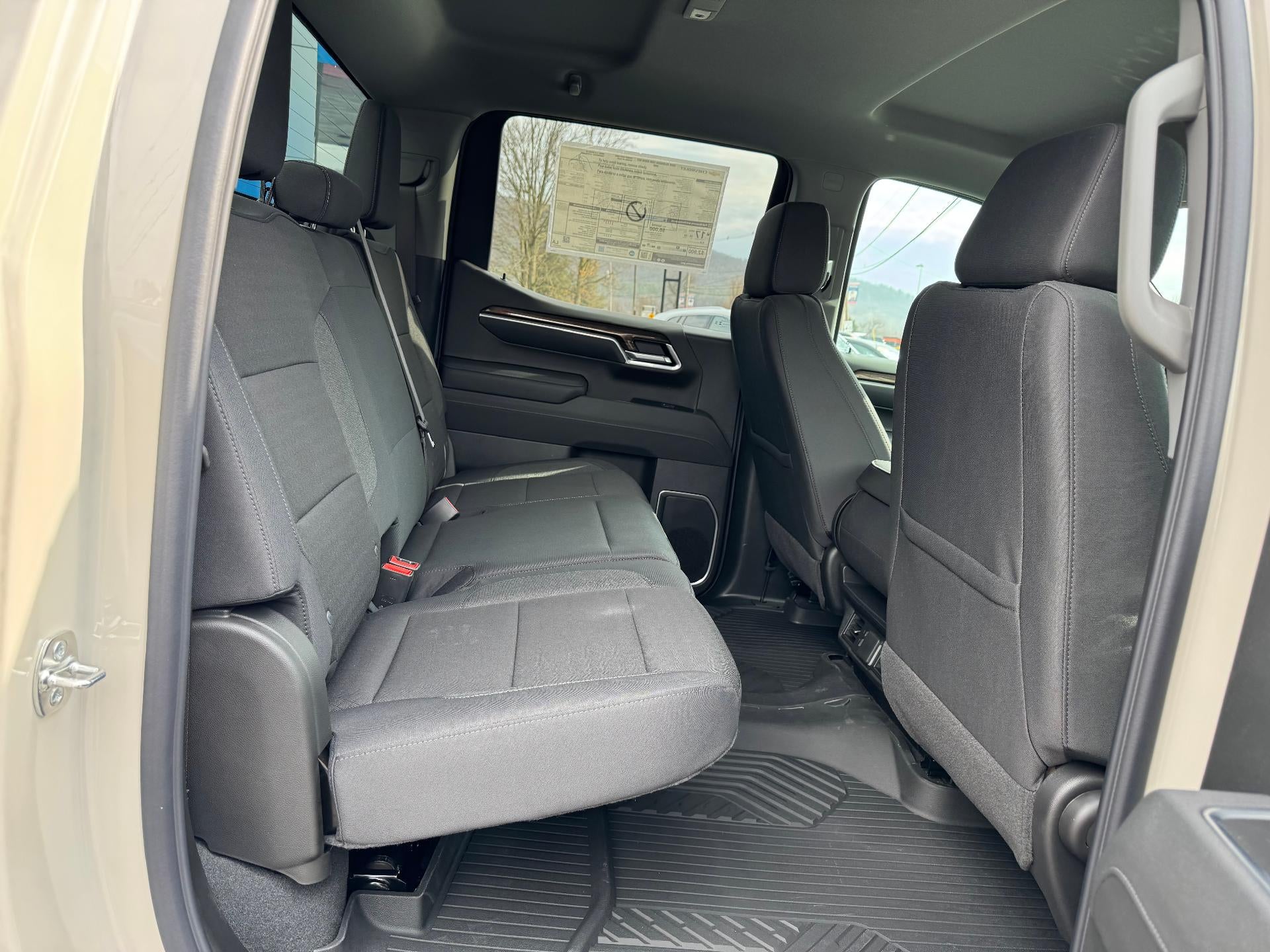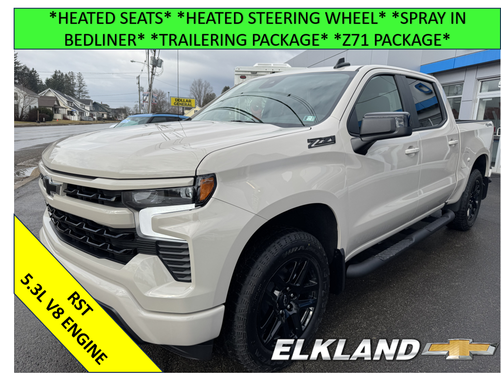 New 2026 Chevy Silverado 1500 Crew Cab Short Box RST 5.3L V8 in White Sands. Equipped with black Cloth interior, Heated seats, Heated steering wheel, Remote start, Z71 Package, Spray in bedliner, 20" Gloss black wheels, Power driver seat, and more.