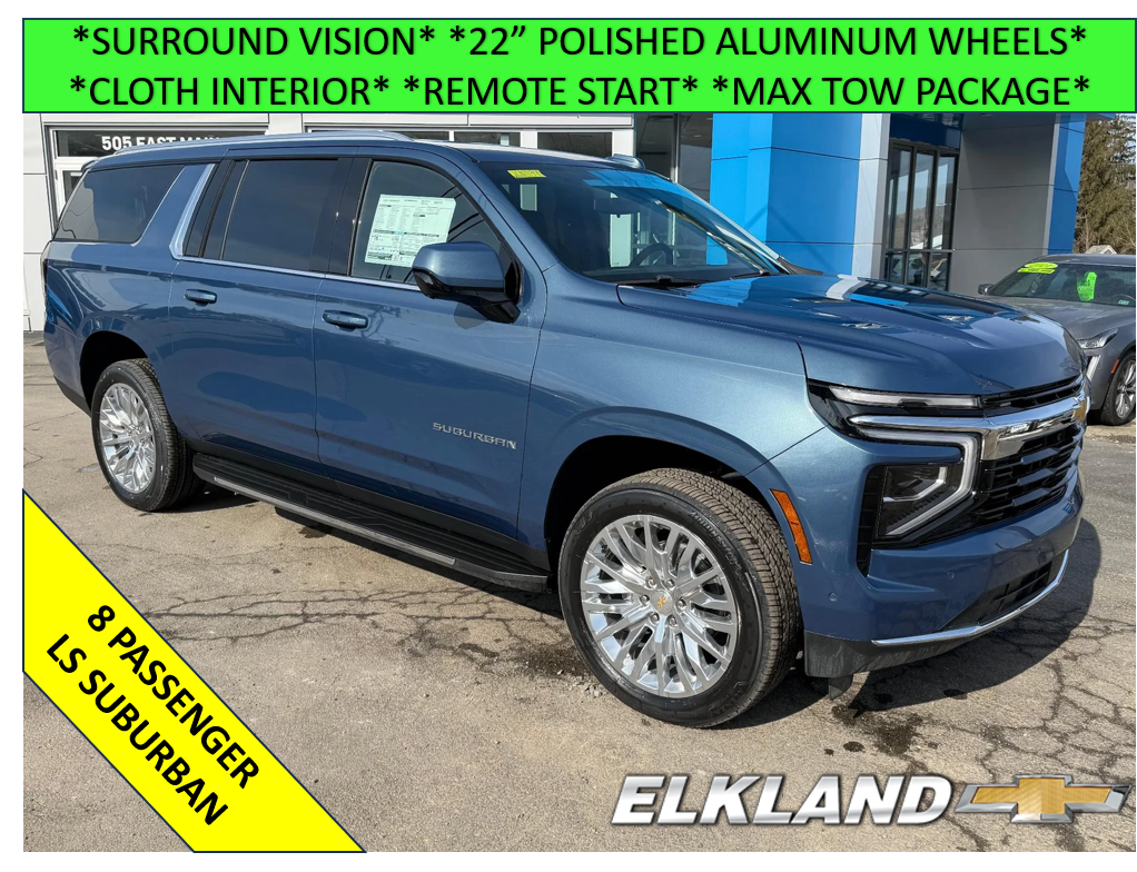 New 2026 Chevy Suburban LS 5.3L V8 4X4 in Lakeshore Blue Metallic. Equipped with black Cloth interior, 8 Passenger seating, Front bucket seats, Remote start, Max Trailering package, 22" Polished Aluminum wheels, Surround Vision, Adaptive Cruise control, and more.