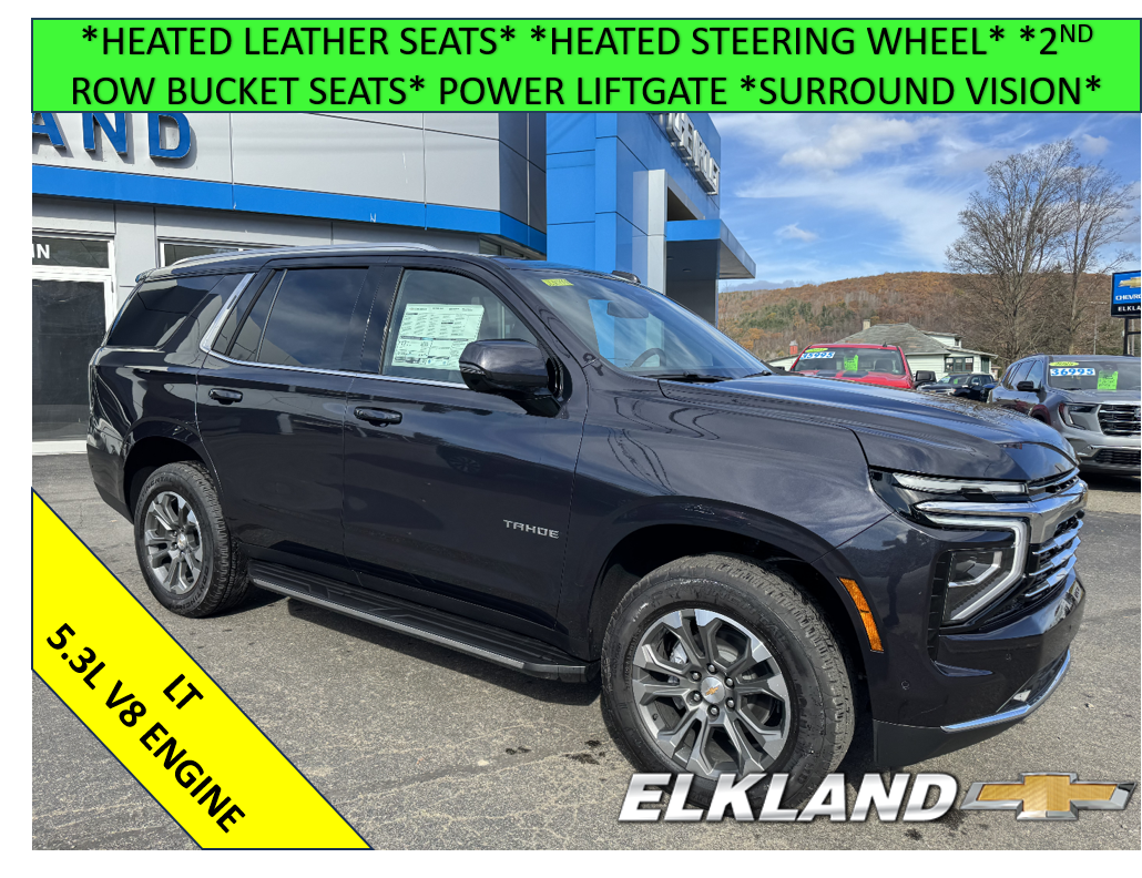 New 2026 Chevy Tahoe LT 4WD in Dark Ash Metallic. Equipped with black Leather interior, Heated seats, Heated steering wheel, Surround vision, 2nd row bucket seats, Power liftgate, Bose speakers, 20" Aluminum wheels, and more.