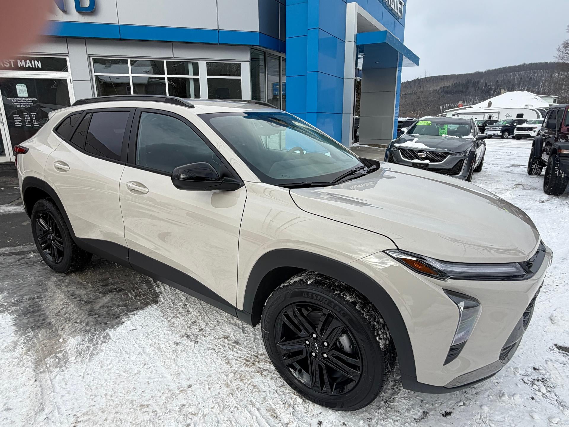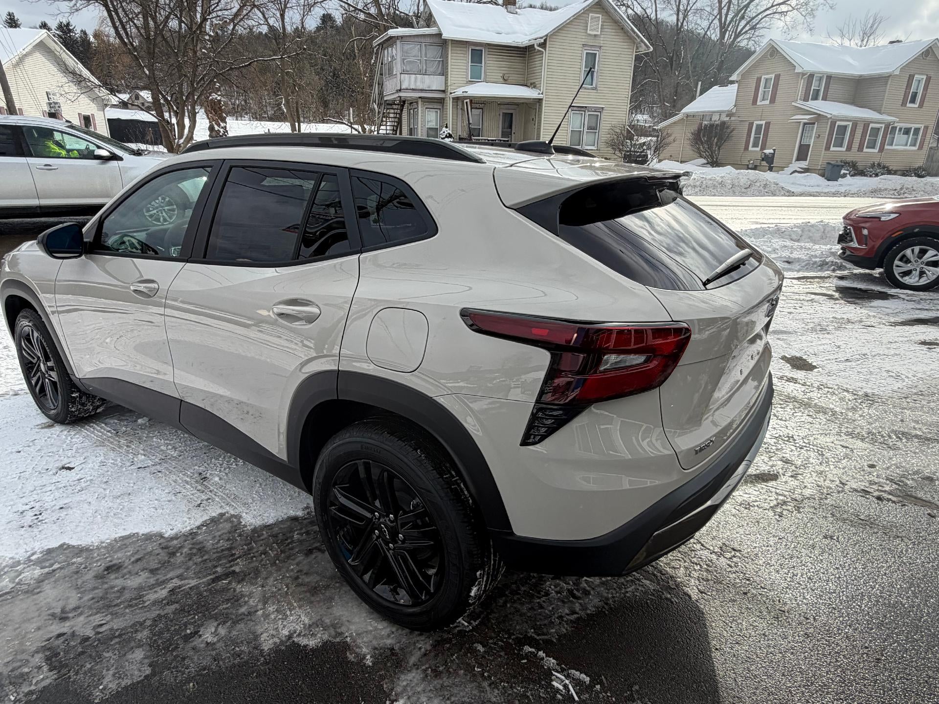 New 2026 Chevy Trax ACTIV in White Sands. Equipped with Black interior, Heated seats, Heated steering wheel, Remote start, Power driver seat, Black gloss wheels, and more.